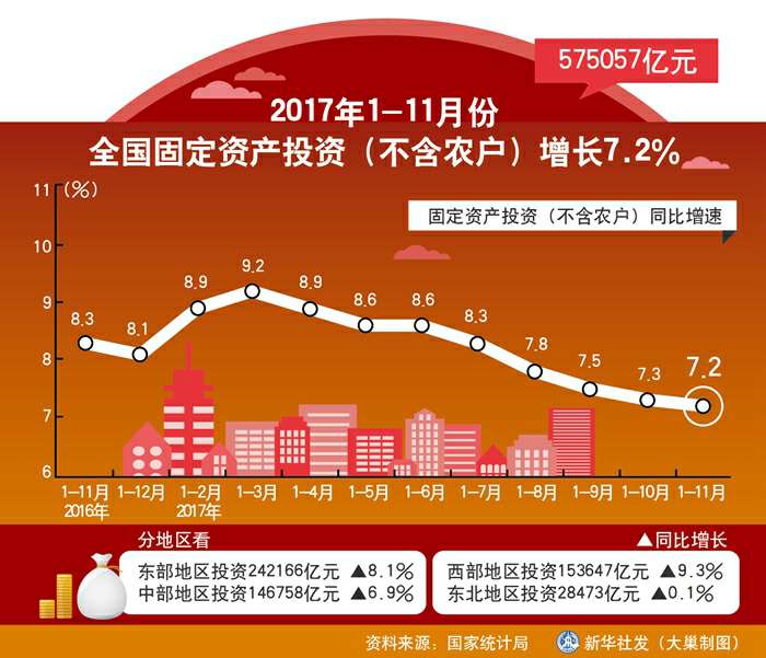 数据显示,1至11月份,全国固定资产投资同比增长7.2%,增速比1至10月份回落0.1个百分点。